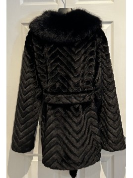 Faux fur coat with snap button closure and waist belt.