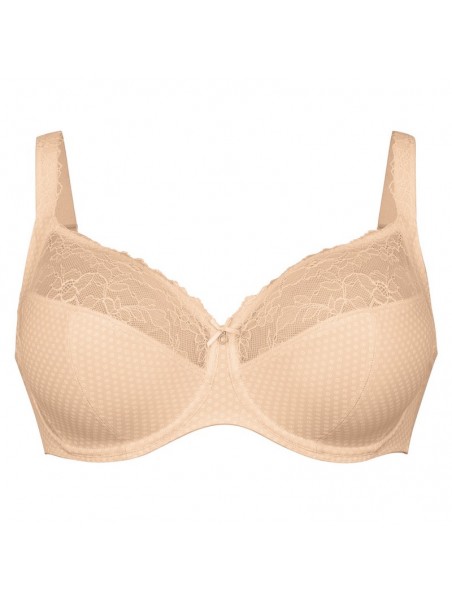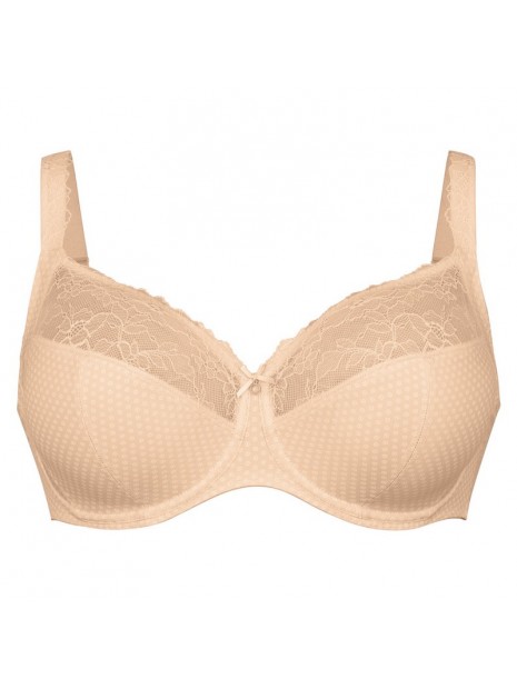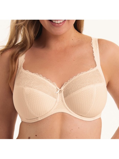 Prix 115,00 $Le soutien-gorge emboîtant à armatures Eloise 5295 de Rosa Faia Beautyfull allie raffinement et maintien optimal. Ses bonnets en quatre parties assurent un galbe parfait et une silhouette élégante. La dentelle florale recyclée, renforcée de tulle fin, et l’imprimé à pois délicat confèrent un style féminin irrésistible. Un anneau orné d’un nœud satin souligne le décolleté avec charme. Les bretelles décorées, plus larges dans les grandes tailles, soulagent les épaules, tandis que le dos renforcé en power mesh double épaisseur garantit un soutien fiable jusque dans les bonnets F à J. Disponible du 32 au 42.
